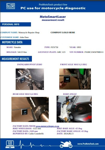MotoSmartLaser: Cost-effective, easy-to-use measuring instrument with 0.1 degree accuracy. Threaded adapters for measuring solid axle motorcycles. Zoll threaded adapters for HD and Buell models on request. Also available for measuring complete frames. Printed measurement results available to the customer with PC software.